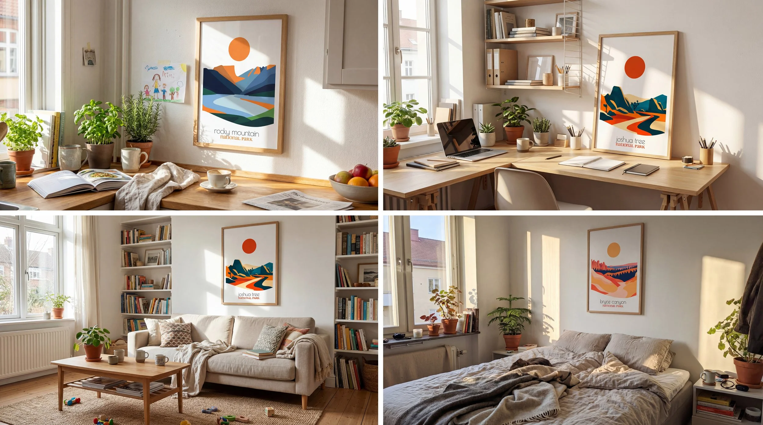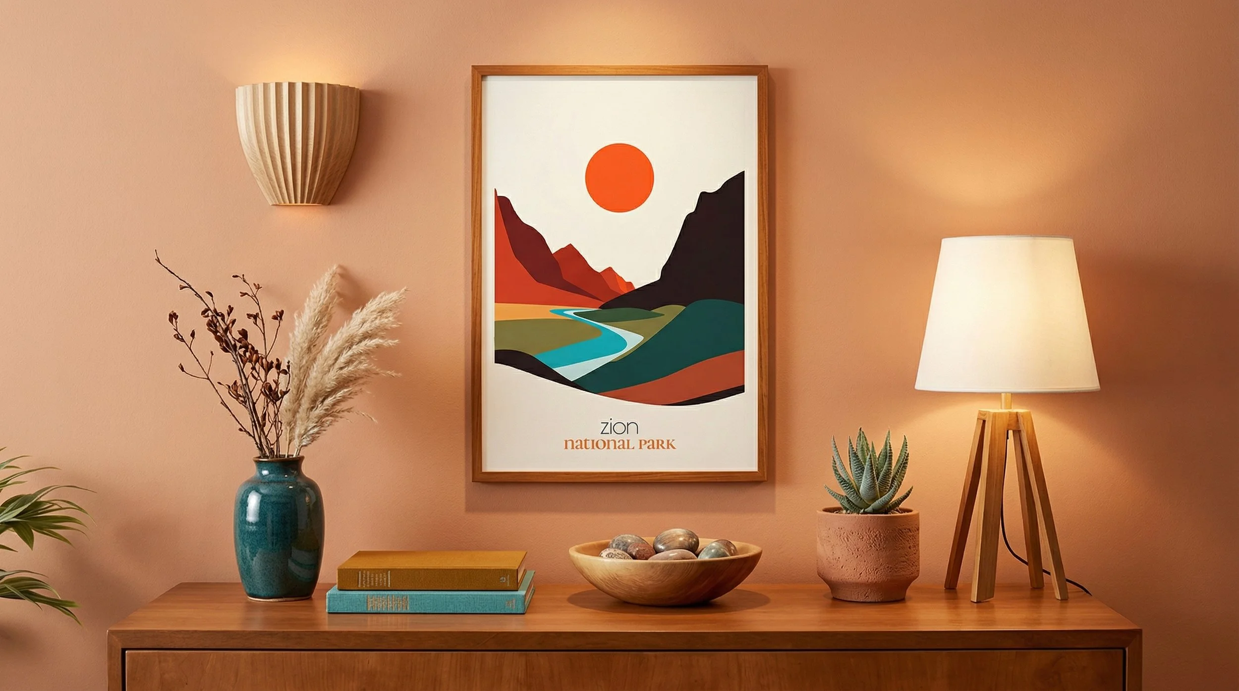 Busy professional → one calming poster near the workspace (Capitol Reef or Pinnacles). It helps you reset quickly.