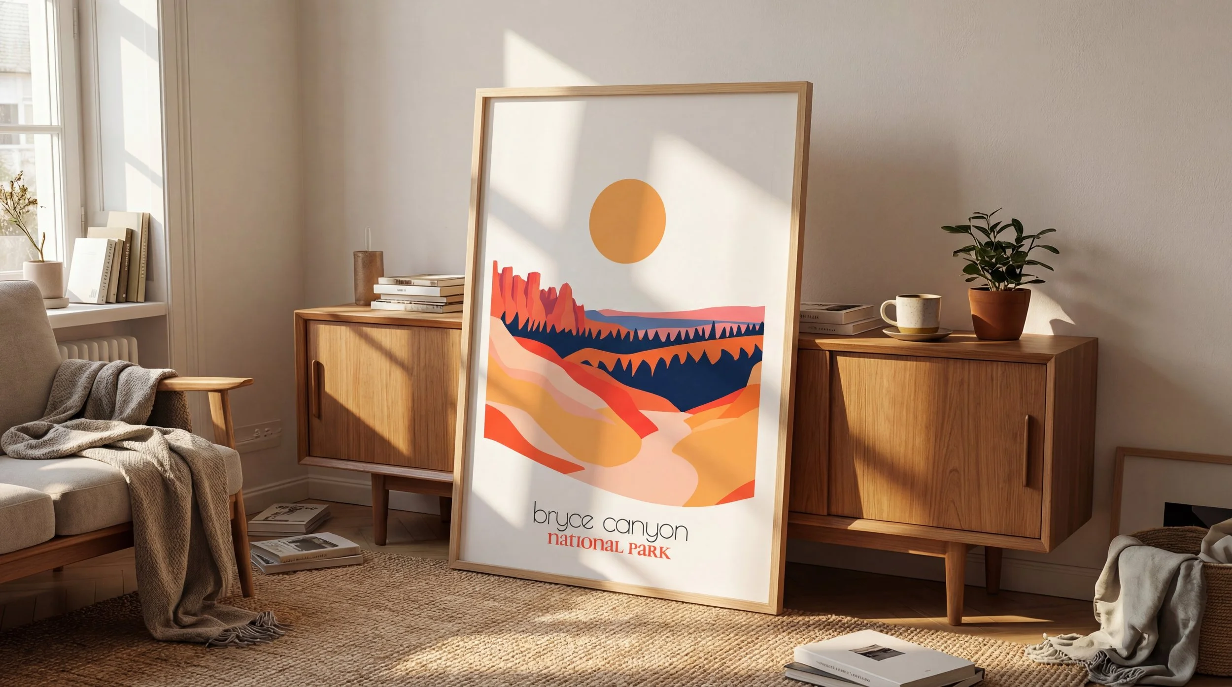 Living room — statement piece or a series (Zion National Park, Bryce Canyon, Monument Valley Travel Poster). Size: 24×36″ for a single poster or 18×24″ for a set.