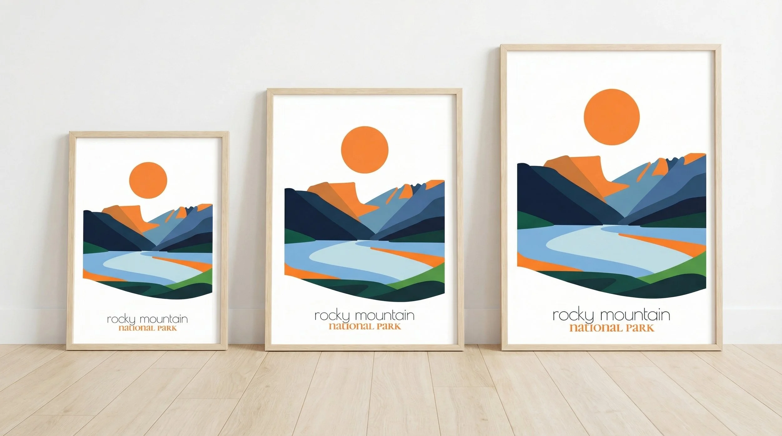 Small (12×16″) for shelves and small walls, medium (18×24″) as the universal choice, large (24×36″) for accent walls. Leave 4–6 inches (10–15 cm) of free space around the poster for better visual harmony.